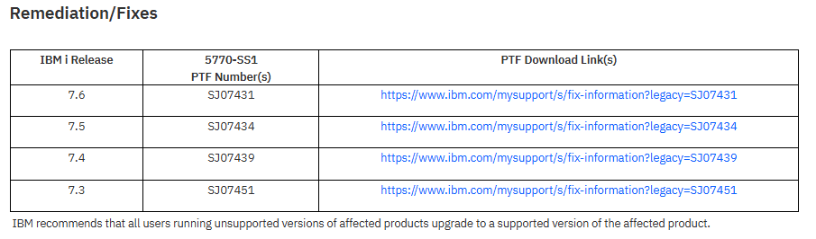 IBM recommande d’appliquer les PTF correctifs correspondant à votre version d’IBM i afin de corriger la vulnérabilité.
