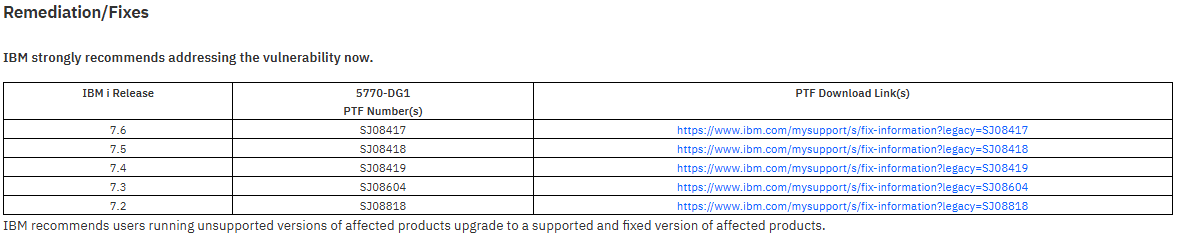 IBM a corrigé cette vulnérabilité via une mise à jour de la Web Administration GUI intégrée à IBM i.